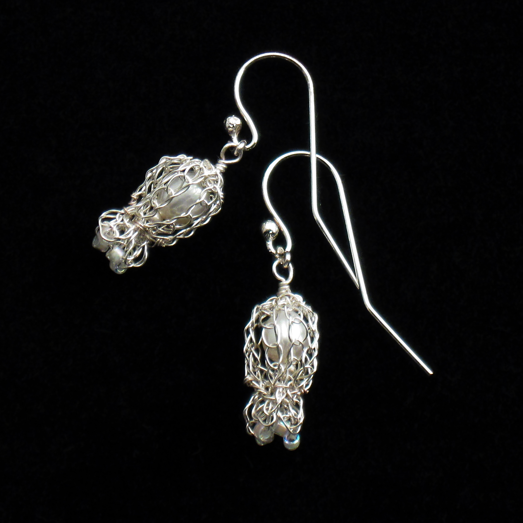 Hand crocheted jewelry in fine silver and semiprecious gemstones featuring lace and floral motifs.