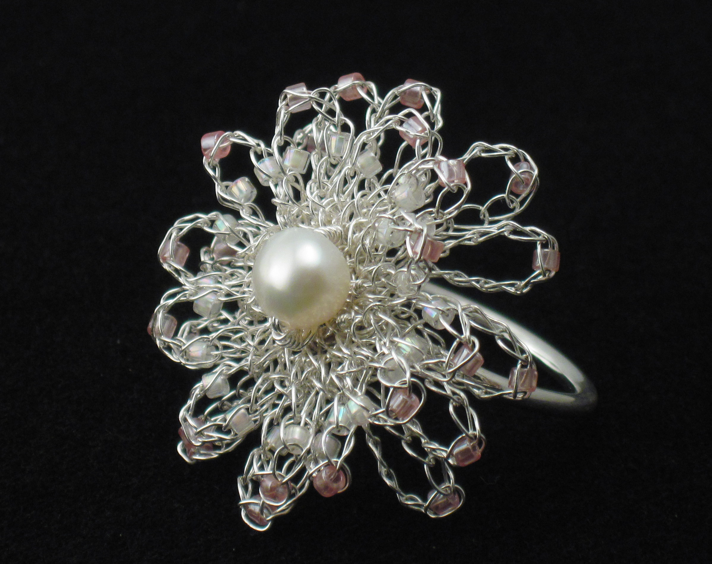 Pink and White Pearl Bloom Ring Fine silver, sterling silver, freshwater pearl, delica beads.