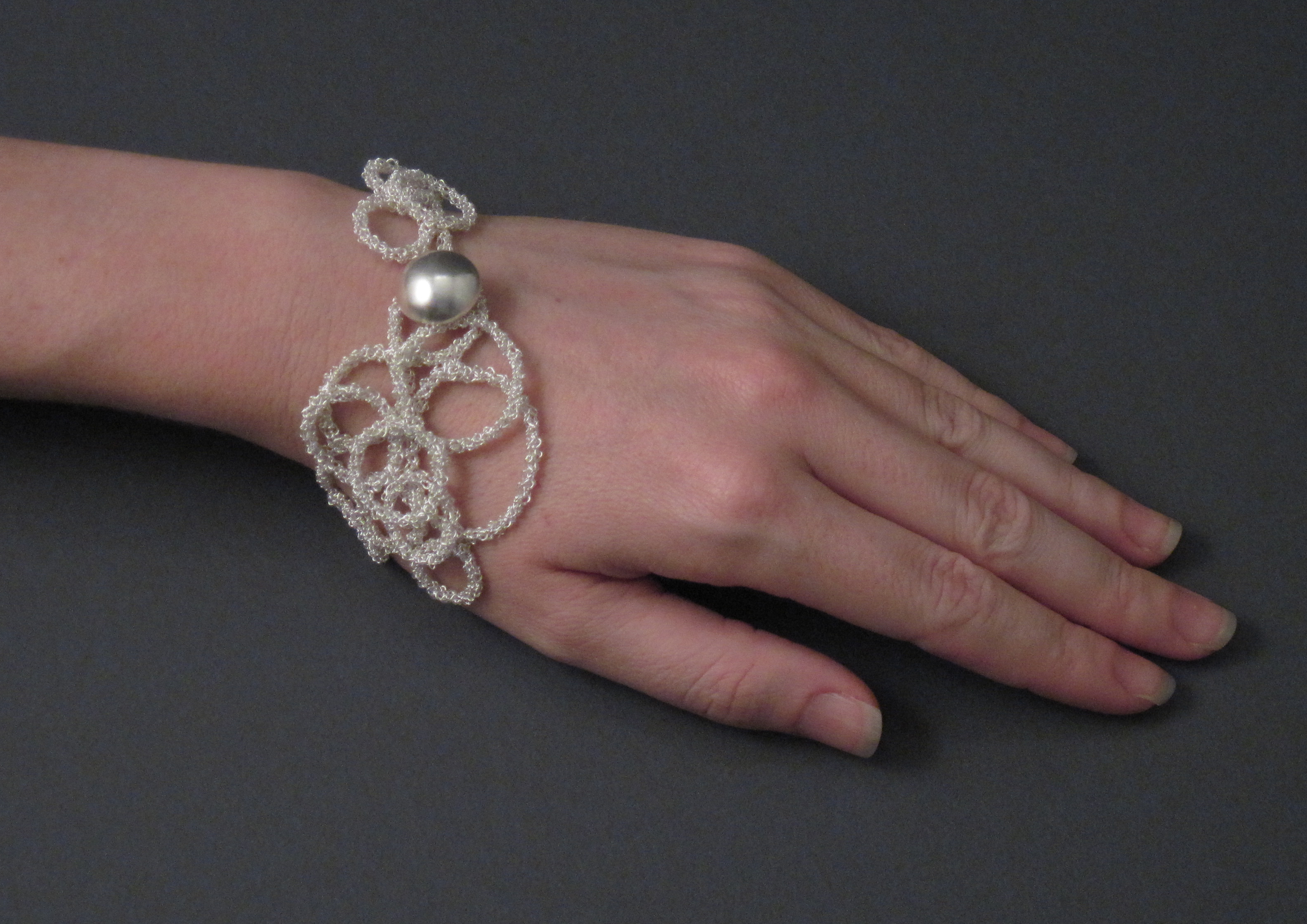 Hand crafted and crocheted jewelry in fine silver and semiprecious gemstones featuring circular elements.